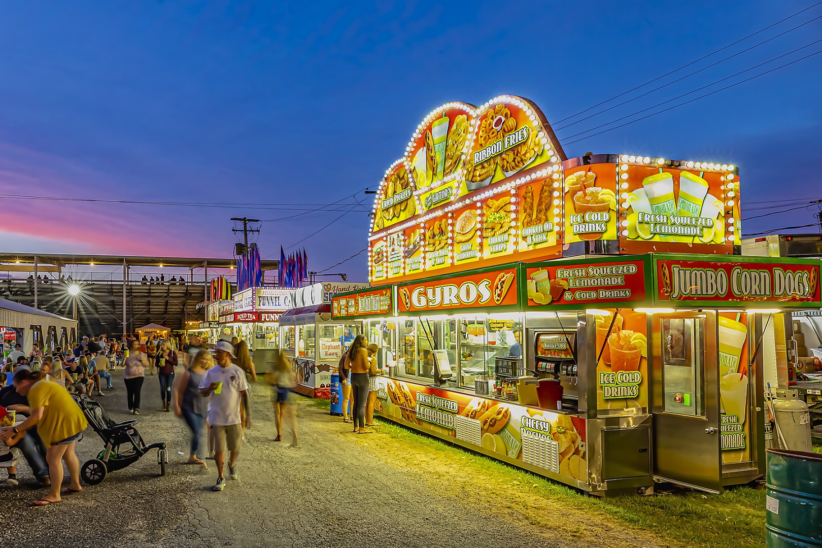 And of course, come hungry. From funnel cakes and deep-fried classics to burgers, corn dogs, shaved ice, and more, the fairgrounds serve up all your favorite treats to keep the night going.