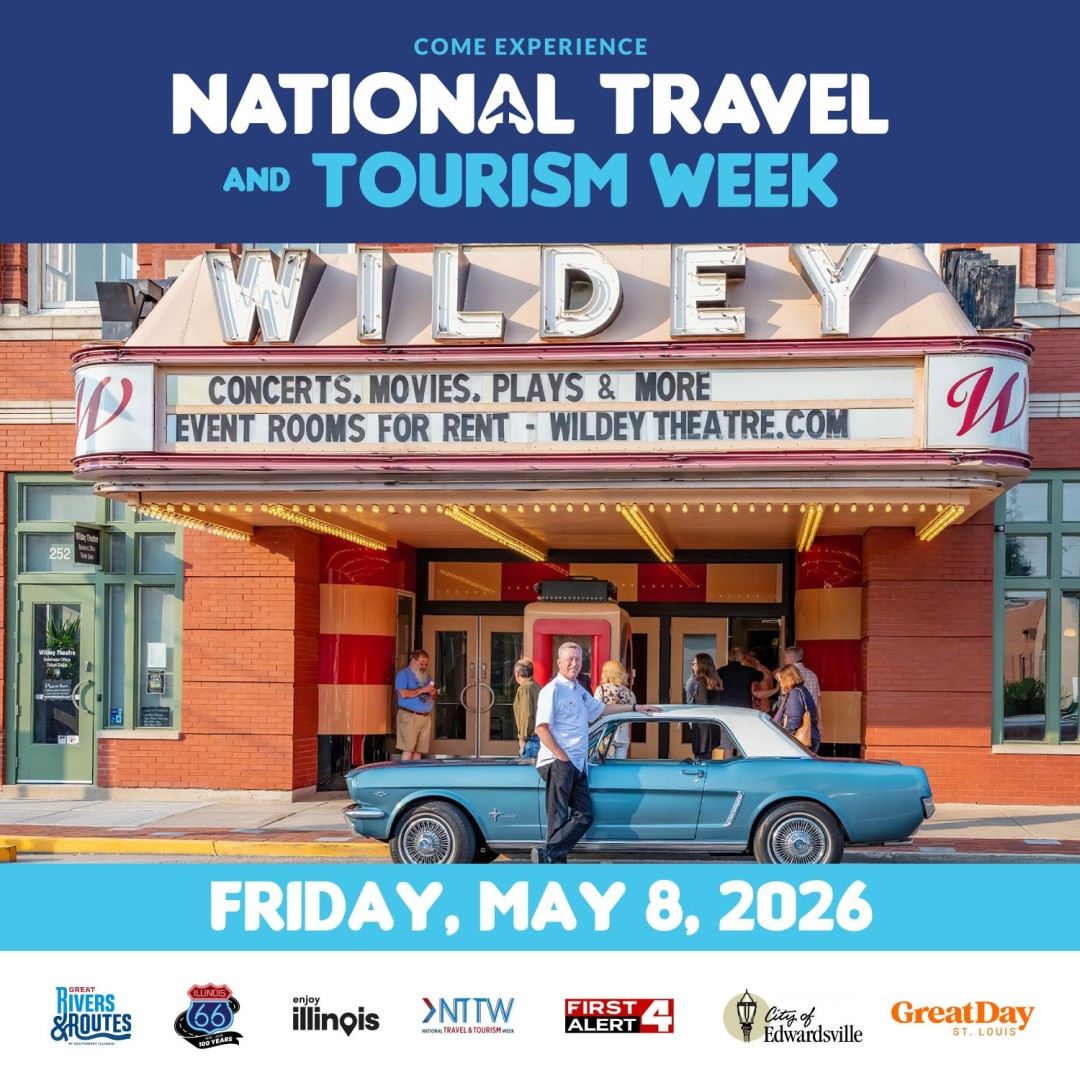 Join us and our friends from Heritage Corridor Destinations, Visit BN, Visit Springfield, Enjoy Illinois, and KMOV News 4 Great Day for a special celebration of National Travel and Tourism Week at the historic The Wildey Theatre on Friday, May 8.