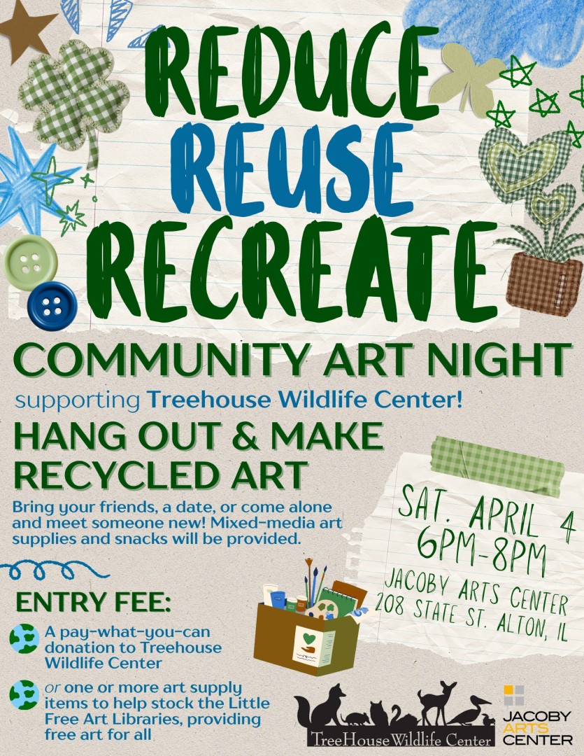 Reduce, Reuse, and Recreate at the Jacoby Art Center Community Art Night supporting TreeHouse Wildlife Center! Bring a friend, a date, or come solo and meet someone new. Mixed-media art supplies and snacks will be provided.